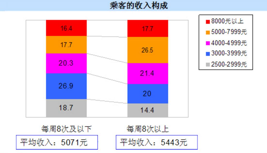 每周乘坐8次以上的乘客月均收入為5443元,該群體擁有更強的消費能力。