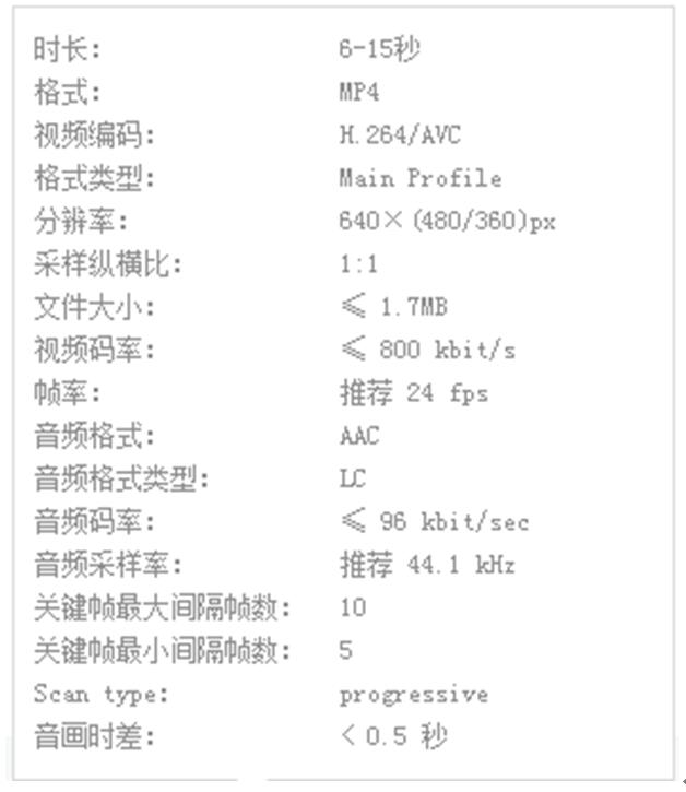 | 1、內圖--圖片規格 暫不支持含有二維碼的圖片 圖片格式:大小不超過300KB,不支持GIF格式 圖片尺寸:寬度750像素,高度不超過1536像素 表現形式及要求網址: https://ad.weixin.qq.com/landing-page-guide.html#/379 2、內圖--輪播圖規格 最多支持5張等高圖片 暫不支持含有二維碼的圖片 圖片格式:大小不超過300KB,不支持GIF格式 圖片尺寸:寬度750像素,高度不超過300-1125像素 表現形式及要求網址: https://ad.weixin.qq.com/landing-page-guide.html#/380 3、視頻規格 視頻自動循環播放 視頻尺寸:寬度750像素,高度不超過1536像素 視頻大小:文件大小不超過1.7MB 視頻長度:不超過15秒 表現形式及要求網址: https://ad.weixin.qq.com/landing-page-guide.html#/382 ? |