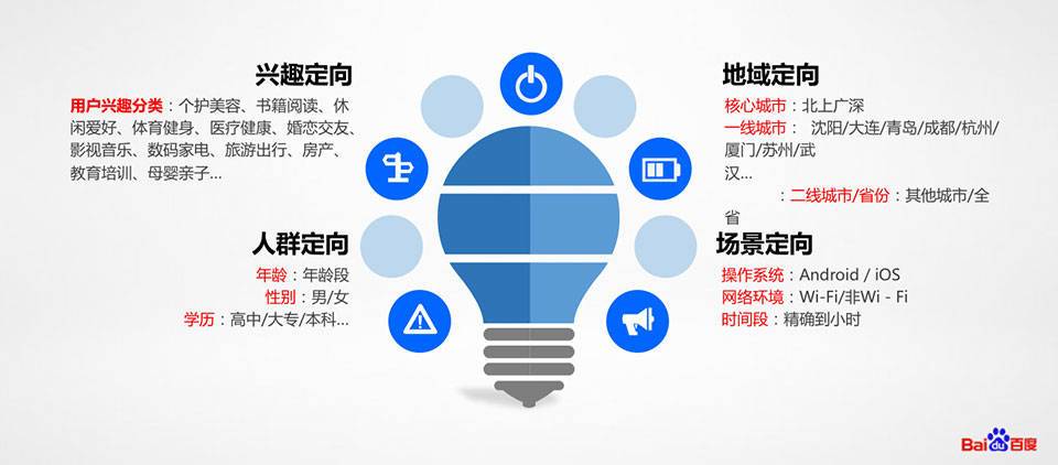 百度大數(shù)據(jù)根據(jù)用戶興趣定向、人群定向,地域定向,場景定向,基本屬性精確鎖定高潛力用戶。