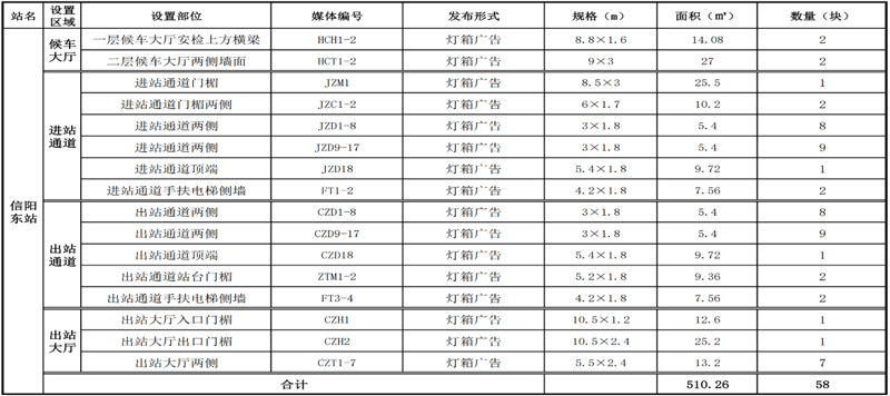 京廣高速鐵路重要組成部分,將信陽(yáng)融入到鄭州和武漢1小時(shí)都市圈輻射范圍;信陽(yáng)東站內(nèi)共有燈箱媒體58塊,媒體面積510.26㎡。