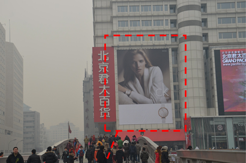 媒體形式:墻面掛布(外打燈) 地 點(diǎn): 西單北大街君太商場(chǎng)墻面(面東)
