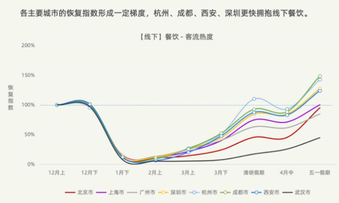 友盟+報告印證了我的觀點。上述8個主要城市,直到4月中下旬,杭州、成都、西安、深圳線下餐飲客流熱度才恢復到疫情前水準,并在五一假期來了波小高潮。相比之下,北上廣擁抱線下餐飲的速度更慢,直到五一假期,北京、上海才勉強接近疫情前水準,廣州恢復到疫情前的七八成,武漢則不到一半。